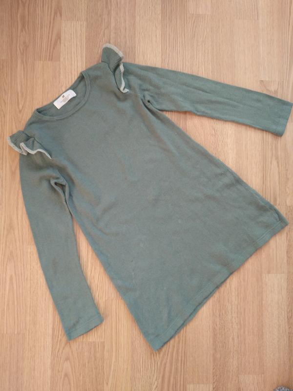 Теплое платье на девочку 6-8 лет фирмы H&M в хорошем состоянии. Указан рост 122-128. Прикрашена рюшою на плечах. Теплая приятная ткань, имеет в своем составе шерсть. Приятный темно оливковый цвет. Состояние красивое. Длина 60 см, ПОГ 35 см, рукав от плеча 46 см, от шеи 52 см.