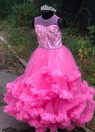На рост 122-130 Стан супер,корсет на шнуровке..на корсете нашит декор с объемными цветами и камешками с переливом Очень приятный цвет барби Продается только платье, без короны