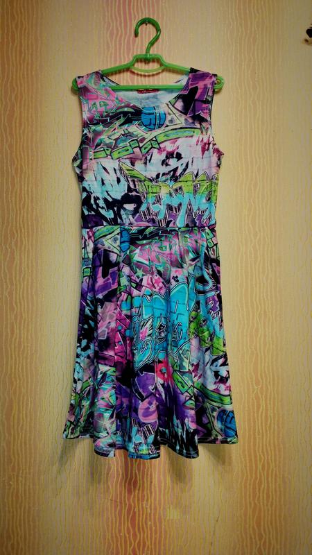 Необычное граффити платье, ткань приятная к телу. Цвета приятные, яркие. Пошито качественно. Состав на фото. Состояние отличное, без дефектов. На возраст 12-13 лет. На рост 152-160 см.. По запросу напишу замеры. Без торга.