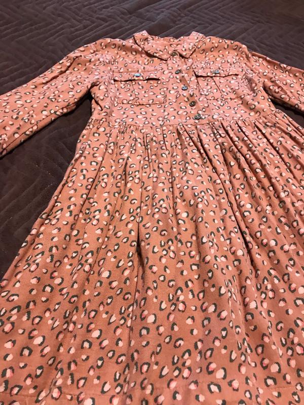 Стильное платье для девочки в лео принте. Замер по спине 62 см. к низу свободное рукав от плеча 41 см. можно защелкать тричетвертые есть пуговица. полхват груди 35 см. на пуговицах.