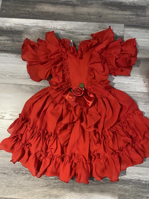 Нарядное платье красного цвета. Имеет натуральную подкладку. Додатково є ще шапочка. Может использоваться как костюм розы. Есть небольшие пятнышки, выводить не пробовали.