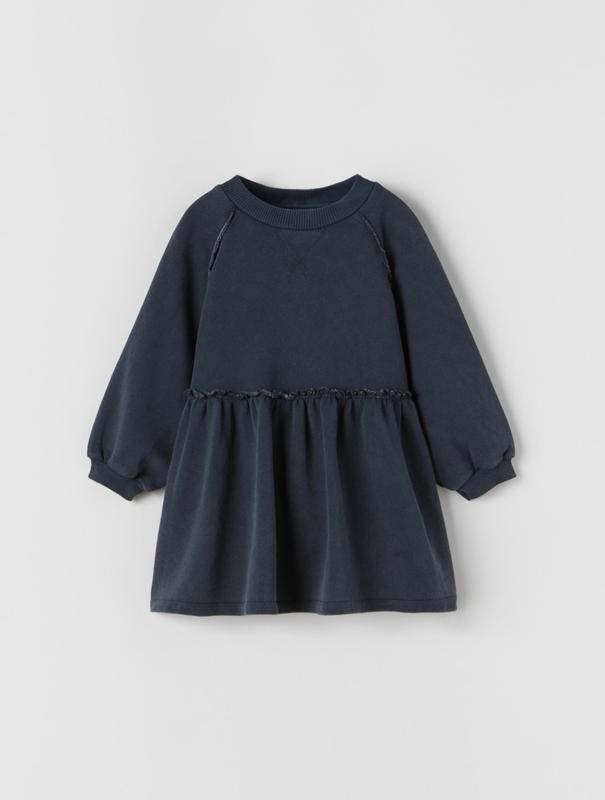Сукня від Zara з імітацією потертостей Темно сірого кольору, вільного крою Тканина двонитка Розмір 3-4 на 104см По грудей 42см Рукав від шиї 41см Довжина 56см