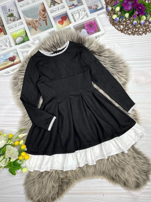 Изысканное платье для красавиц 💗 Ткань замш диагональ, украшена кружевом Сзади застегивается на молнию Замеры: длина/ширина под руками/рукав от плеча 122 - 61/30/41 128 - 66/31/44 134 - 67/33/46 140 - 68/35/49 146 - 70/37/51 122 - 2 128 - 2 134 - 2 140 - 2 146 - 2
