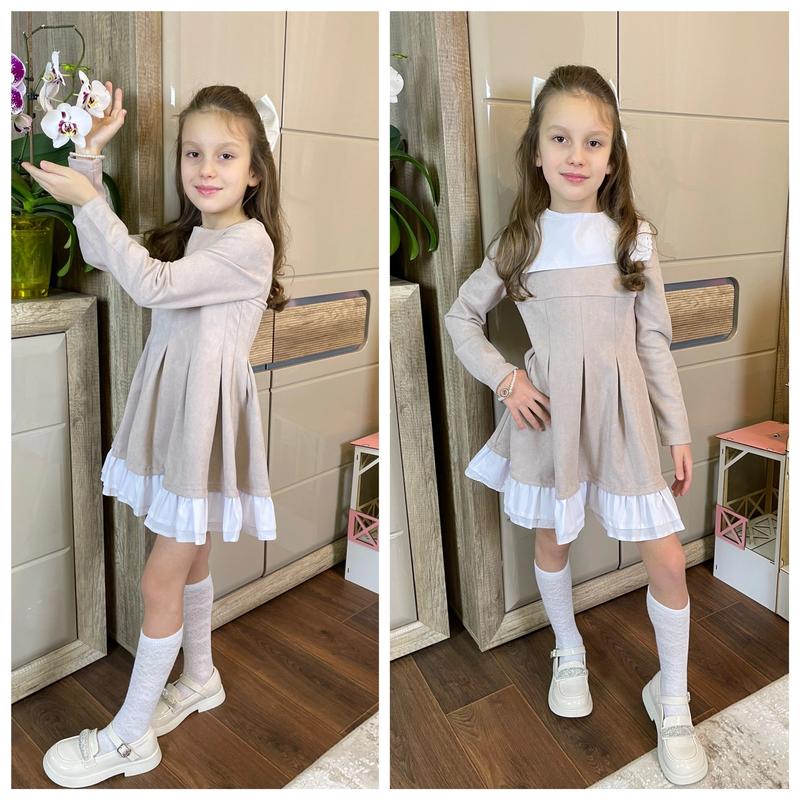 Изысканное платье для красавиц Ткань замш диагональ, украшена кружевом, воротник снимается Сзади застегивается на молнию Замеры: длина/ширина под руками/рукав от плеча 122 - 61/30/41 128 - 66/31/44 134 - 67/33/46 140 - 68/35/49 Арт са