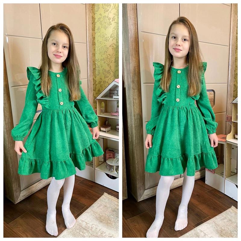 Нарядное стильное платье для красавиц 💗 Ткань вельвет, завязывается под поясок, спереди украшена пуговицами, сзади застегивается на молнию Замеры: длина/пог/рукав от плеча 116 - 63/30/39 122 - 66/31/44 128 - 69/33/47 134 - 72/35/49 116 - 2 + 2 122 - 2 128 - 2 134 - 2