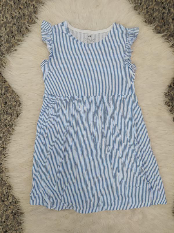 Платье в полоску для девочки 6-8 лет h&m (030924) Рост 122/128 Тканина коттон Цвет как на фото на девочке голубая-белая полоска Длина 64 Плечи 28 Груди 34 Талия 34 Бедра любимые Без дефектов