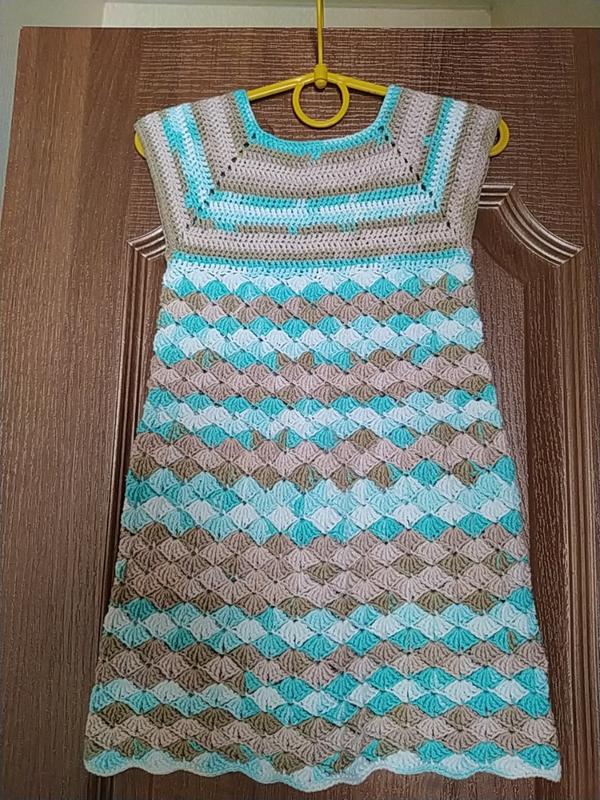 Платье ручной вязки из хлопка, плотненькое, но в то же время с дырочками небольшими и не жаркое, немного удлинённое до колен, можно весной под водолазку, реглан и ажурные колготки или длинный гольфы или летом. Смотрится очень классно.