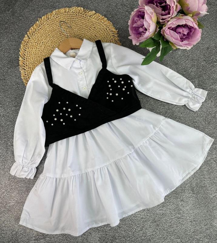 Невероятно стильное платье-рубашка Ткань-бабовная С черным топом с бусами Очень хорошо сидит на ребенке Хорошее качество! Подойдет под большое количество образов 4У/104 – длина 54 см, шир 30 см, рукав 41 см. топ - длина 26 см, шир 34 см (2 шт) 5У/110 – длина 56 см, шир 31 см, рукав 43 см. топ - длина 27 см, шир 35 см (2 шт) 6У/120 – длина 60 см, шир 31 см, рукав 47 см. топ - длина 29 см, шир 37 см (5 шт) 7У/130 – длина 65 см, шир 33 см, рукав 50 см. топ - длина 31 см, шир 39 см (3 шт) Рукав от горловины