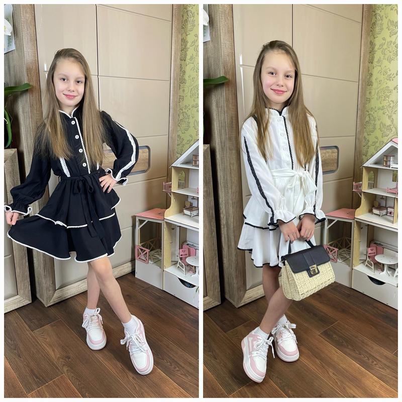 💝Красивое весеннее платье для девочек 🏷Размеры: 128-152 🪡Ткань: креп жатка, легкая, мягкая и приятная к телу, украшенная кружевом, выглядит очень нежно, застегивается спереди на пуговицы, в поясе резиночка+завязывается под поясок 📐Замеры: длина/пог/рукав от плеча полностью 128 - 66/34/43 134 - 68/34/45 140 - 69/36/47 146 - 72/37/50 152 - 76/39/53 Арт са