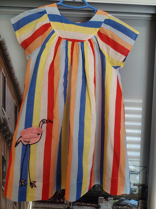Яркое летнее платье в разноцветную полоску из хлопка, украшенное изображением фламинго. Платье идеально для жаркого лета. Бренд: next Состояние: идеал Размер: 98 см