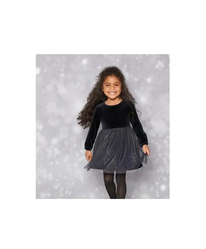 Платье с длинными рукавами из мягкого велюра и фатина. Круглый вырез горловины, слегка расклешенная юбка со слоем фатина сверху. Застежка-молния на спине. Длина рукава: длинный рукав Вырез: Круглый вырез Описание: гранатовый. Ткань - 93% полиэстер (переработанный), 7% эластан (LYCRA®) юбка: 100% полиэстер (переработанный) Размер в наличии на рост 98/104, 122/128см