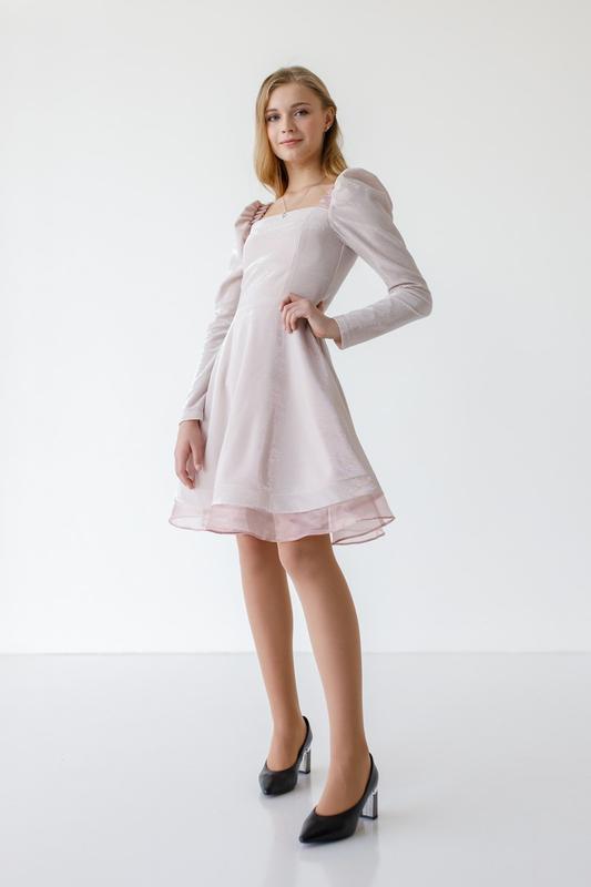 Нежное праздничное платье для девочки пудрового цвета с серебристым люрексовым отблеском известного украинского бренда Suzie, красивый вырез каре, рукава буф, закрывается на молнию в среднем шве по спинке, имеет под юбку розового цвета. Купила девочке 11 лет, на рост 152 длина до колена ПОГ 39 ПОТ 33 Длина 89 Длина рукава 62
