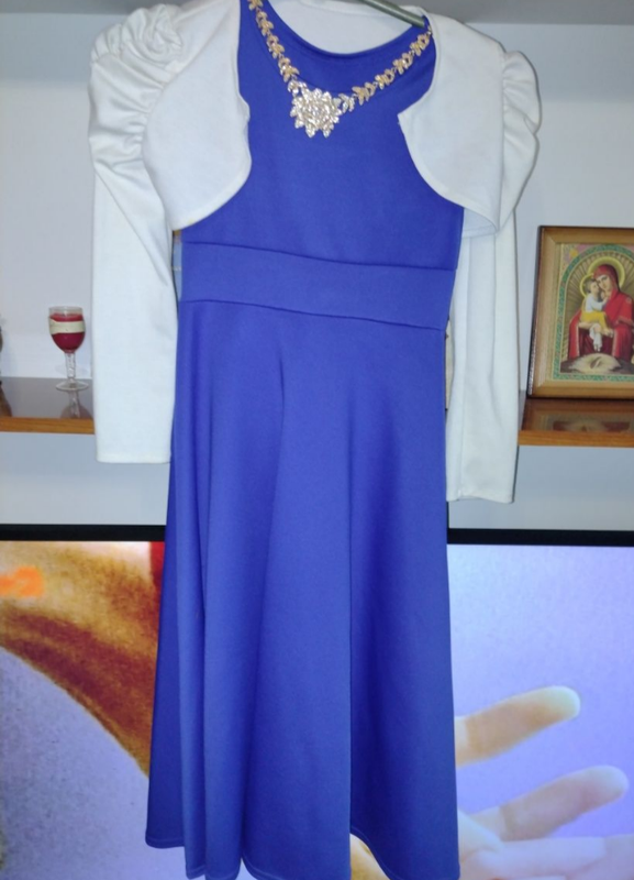 Сукня дитяча святкова Відмінна якість ❤️ Купувалася в садочок на випускний! До комплекту входит біжутерія (серьги+кольє), накидка и плаття! Стан ідеальний!! Одягалось 2 рази Тканина креп дайвінг, добре тягнеться, гарна якість Довжина 93 см Талія 29 см Плечі 25 см Довжина топа 20 см Довжина рукава 47 см Плечі 27 см
