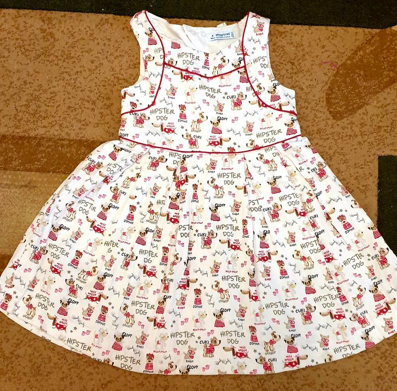 платье белое в собачках возраст 4 года производитель Mayoral материал котон платье отрезное по линии талии спинка платья полуоткрытая сзади застежка - молния и кнопки, которые отделаны бантом по линии талии и по проймам платье украшено красным кантом о/г 54 см о/талии 54 см длина изделия 51 см
