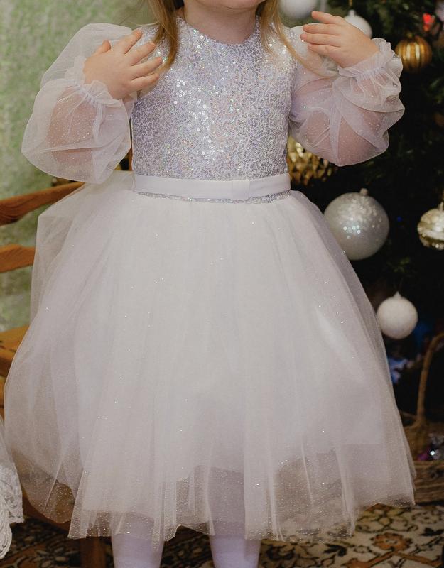 Білосніжна сукня для принцес Колір:біла з блискітками по всій сукні, верх - паєтки Розмір 104( підійде і для 110) Одягали один раз на фотосесію Є нюанс - низ фатинв( на фото)