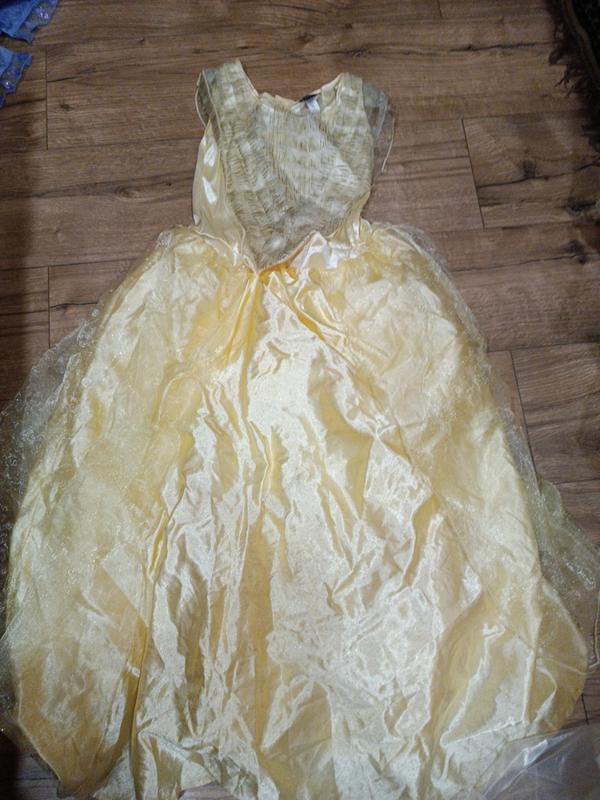 платье подойдет как на роль принцессы бель или Золушки или просто на какой-нибудь выход платья желтого цвета состояние среднего пятна отсутствуют сзади на спинке только их чуточку затяжек на 8-10 лет