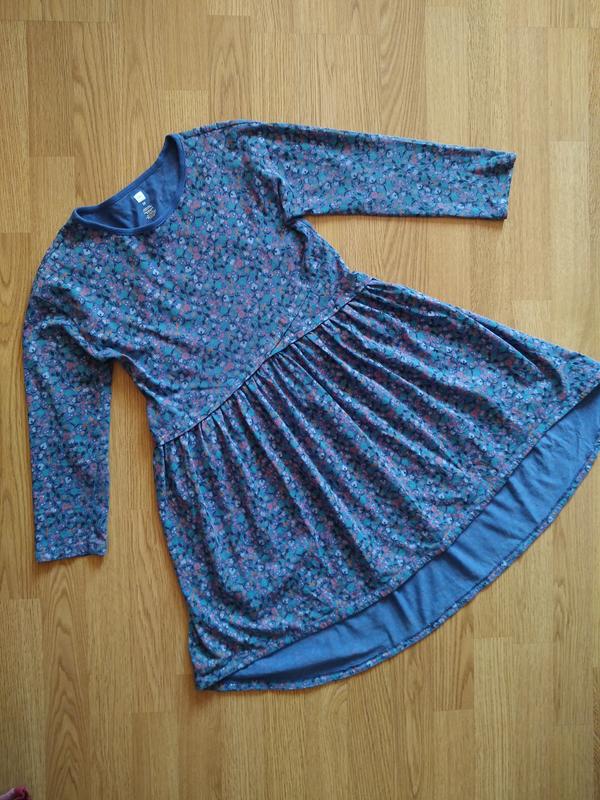 Платье в цветочный принт на девочку 9-10 лет фирмы в идеальном состоянии. Перед платья укороченный, рукава также. Зад удлиненный.Цекатый фасон, можно на полную. Длина платья спереди 71 см, зад 82 см. Рукав 3/4, от шеи 51 см, от плеча 38 см. ПОГ 39 см. Тянется.