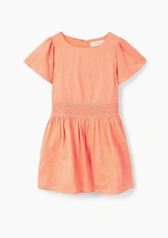 Персикова сукня з ніжної віскози від Mango. Ніжний, романтичний фасон. Прикрашена вишивкою та рукавами-крильцями. Тканина натуральна, приємна на дотик, завдяки чому сукня ідеально підходить для прогулянок в жаркий день. Розмір вказано 122см (6-7 років) Довжина 64см Ширина в поясі 35см Нова з бірками. Куплена в Іспанії