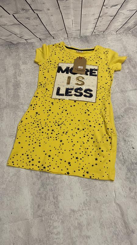 Трикотажна сукня для дівчинки розміру 140 – це зручний і стильний варіант для щоденного носіння. Опис: • Матеріал: м’який та еластичний трикотаж (ба • Фасон: прямий або злегка приталений крій • Довжина: до коліна або трохи нижче. • Рукав: короткий. • Декор: мінімалістичний принт. • Колір: жовтий. . Ця сукня ідеально підходить для прогулянок.