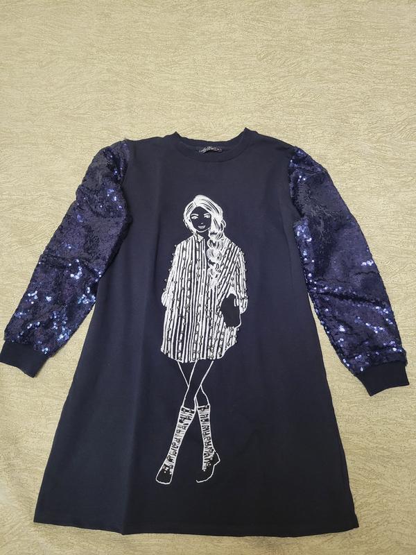 Стильное праздничное платье, синего цвета, рукава пайетки, девушка украшена металлическими бусина. 100% хлопок, мягкий и приятный к телу. Угоду увлажняюще. Состояние новой, одевали 1 раз в театр. Подойдет на 10-11 лет. Лучше ориентироваться по замерам. Замеры: ширина переда 44см, длина от плеча 72см длина рукава от горловины 61см