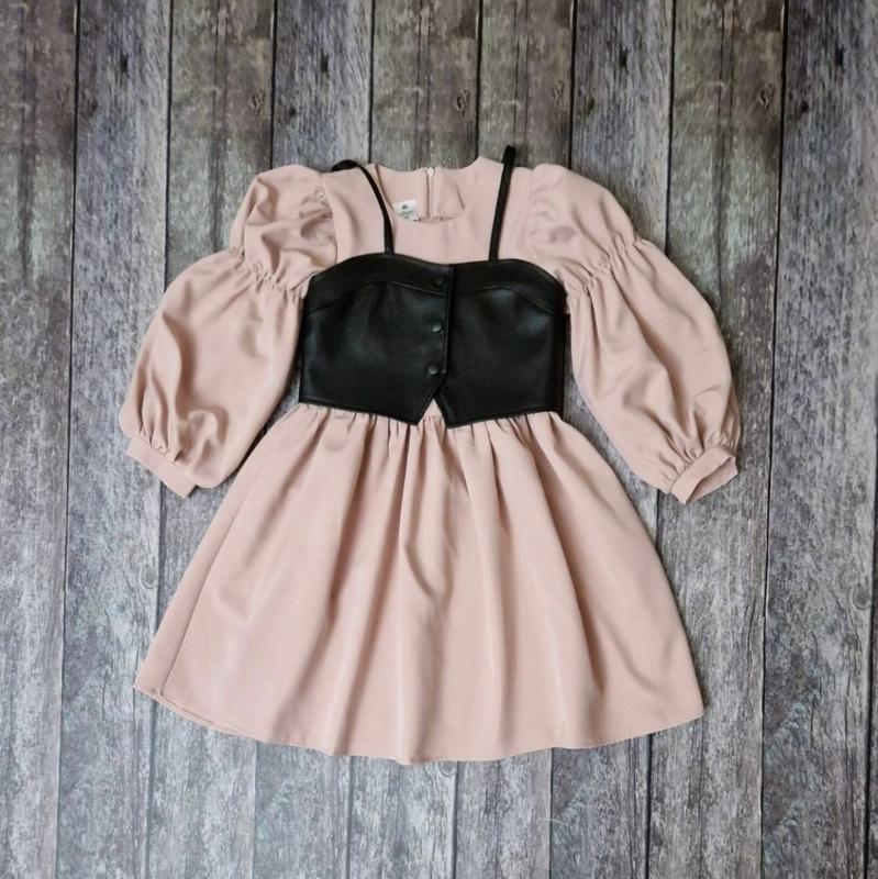 Стильное платье для модниц По спинке к поясу застегивается на молнию. Ткань костюмная, топ - экокожа. Замеры: 140 длина - 72см, рукав от горловины - 55см, полуобхват груди - 34см 146 длина - 76см, рукав от горловины - 59см, полуобхват груди - 37см 152 длина - 82см, рукав от горловины - 64см, полуобхват груди - 39см 158 длина - 86см, рукав от горловины - 66см, полуобхват груди - 41см Мс