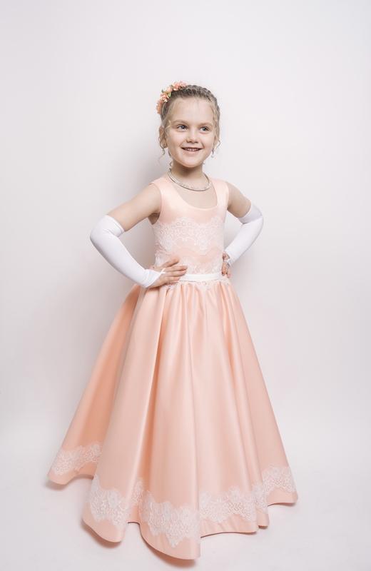 Вид товара: Нарядное платье Сезон: Всесезонна Материал: Атлас, Кружево Пол: Девочка Цвет: Белый, Персиковый Производитель: Украина Размер 32 Платье одевалось только один раз в выпускной, продается без перчаток.