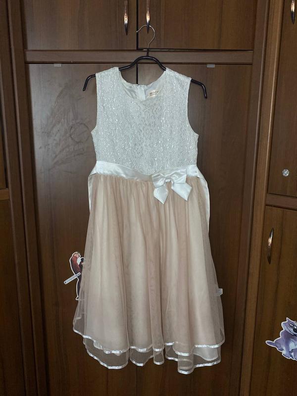 Нарядное платье для девочки. Верх из белого гипюра с серебряной нитью, на подкладке. Юбка 4 яруса, 2 шелка и 2 евросетка. Размер 158, но мы надели на рост 146, на выпуск в 4-м классе. Платье нарядное и элегантное, в отличном состоянии.