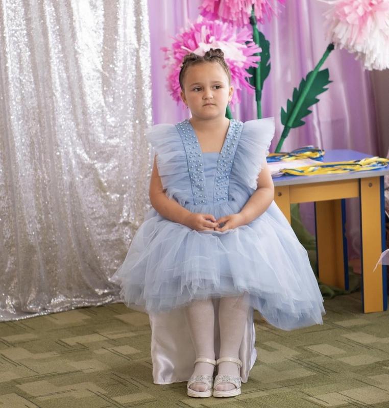 Стильна сучасна модель сукні, пошита за замовлення . Сукня, одягнена один раз . На вік 5-6 років . Орієнтовно ріст 122. Ззаду на корсеті .
