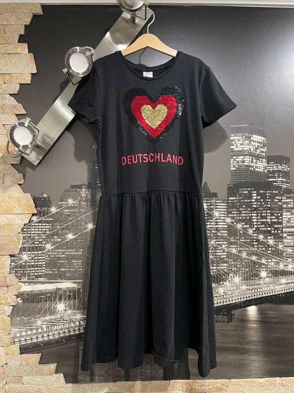 Детское черное коттоновое платье-миди бренда C & A, с разноцветным сердцем с пайеток, которые двигаются по цвету, состав:100%коттон, замеры:ПОГ 38 см,ПОТ 32-33 см, длина 85 см.