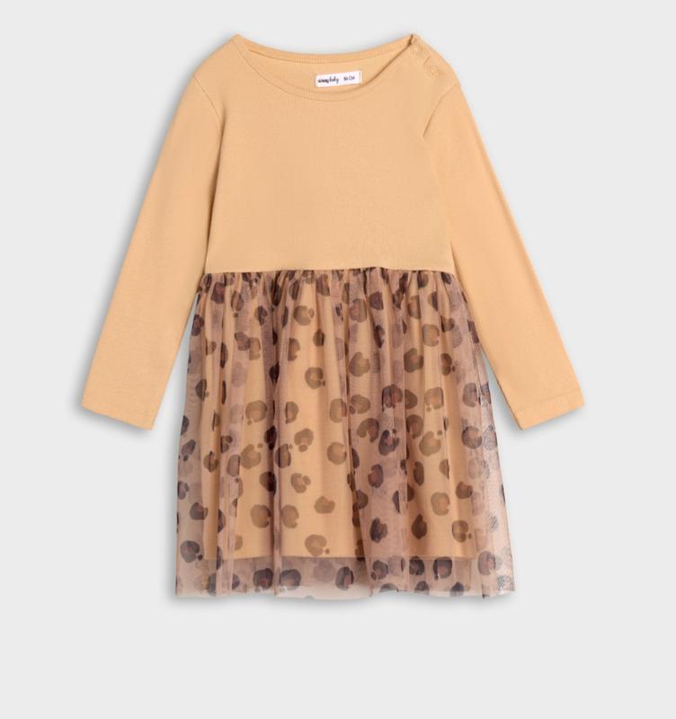 Фірмова сукня з принтом Лео. Кругла горловина, крій розкльошений, застібка ґудзики-кнопки, фатінова спідниця. Матеріал: 95% бавовна, 5% еластан. Розміри: 68-98 (уточнюйте)
