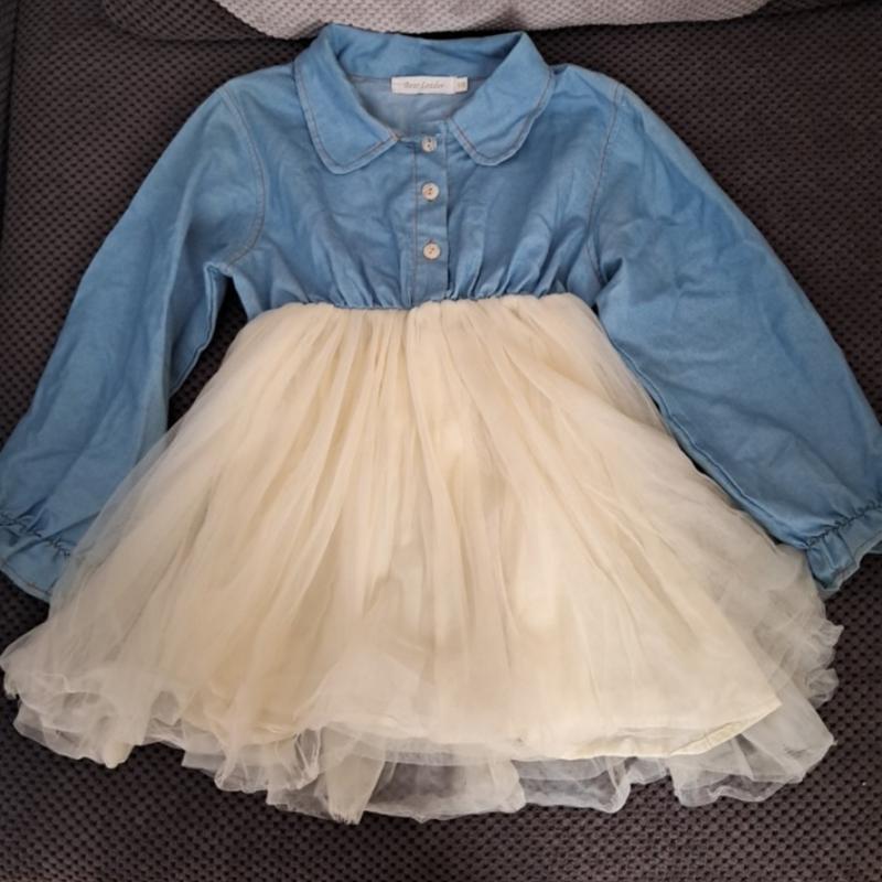 Пышное платье.Верх-тонкий джинс,низ- 3 шаровара юбочка.Рист указано 130, по замерам соглашений.Цвет как на 2 фото