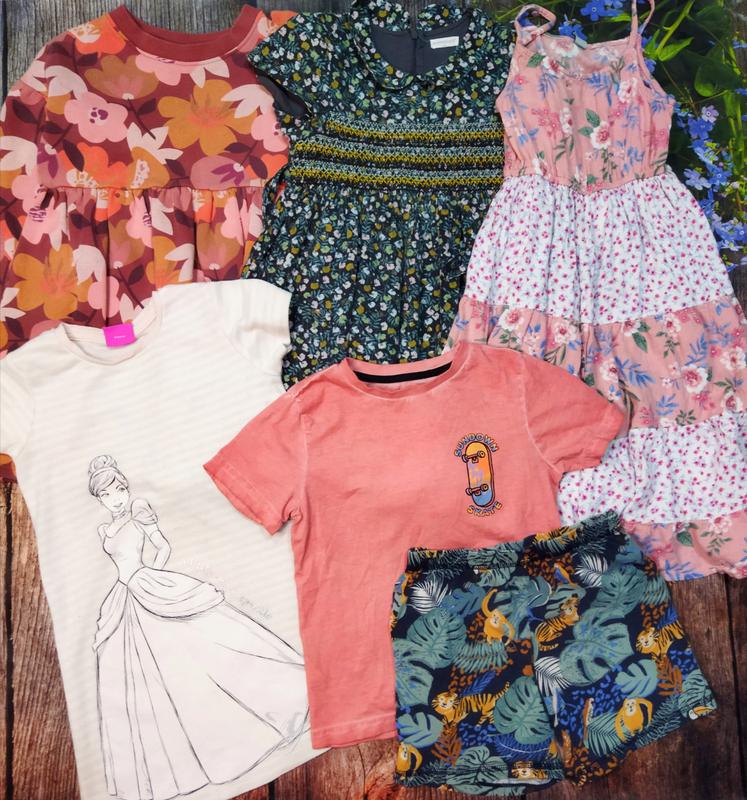 Набор фирменных вещей для девочки 6-7 лет. Состояние новых В набор входит: Платье- Next Платье- Disney Платье - TU Платье - HAPPYYOLOGY Футболка - F&F Шорти - George