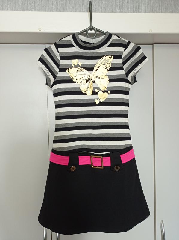 Трикотажное платье для девочки. В отличном состоянии. Длина 80см, ширина груди 34см. Декоративный пояс на бёдрах. Юбка полиэстер.