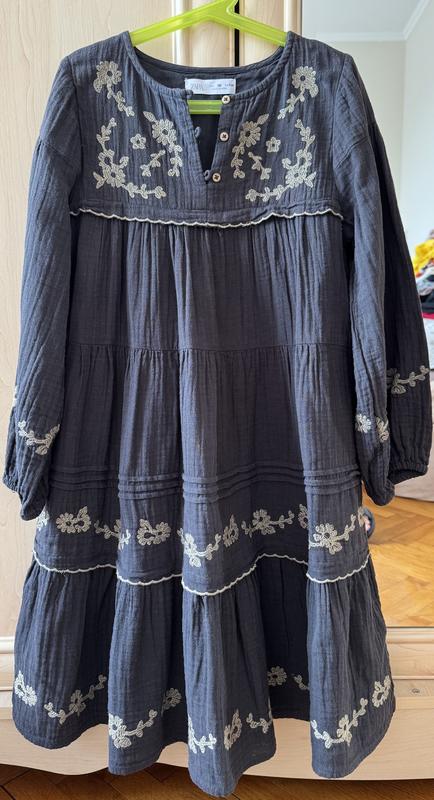 Сукня темно сірого кольору з орнаментом, літня, легка, бавовняна , на довгий рукав розмір 134-140 см