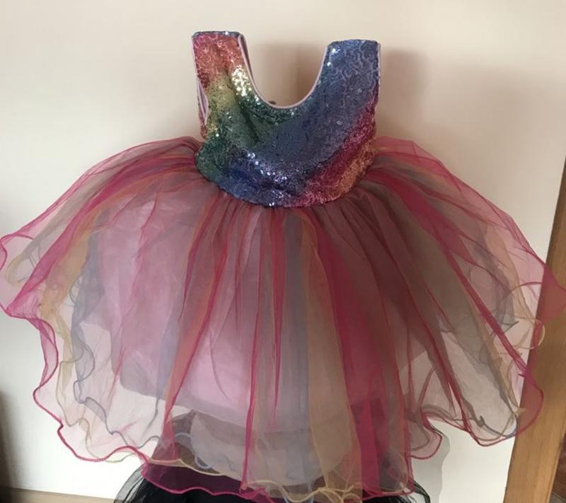 Очень нарядное платье Объем талии до 53 см Длина платья 50 см Три слоя цветной фатин( розовый, желтый, голубой) Два слоя подюбника Замочек секрет на спине