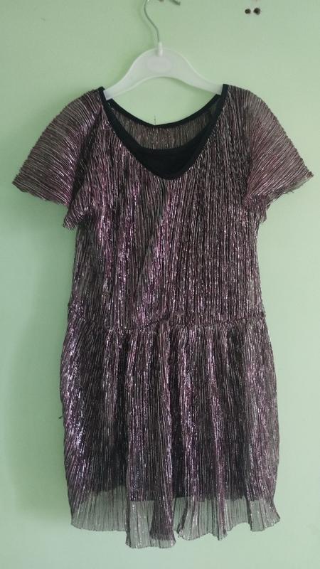 Двойное платье, снизу под блестящим материалом мягкая ткань. Есть несколько затяжек и небольшой разрез снизу примерно 1.5-2см(фото). На солнце очень переливается.