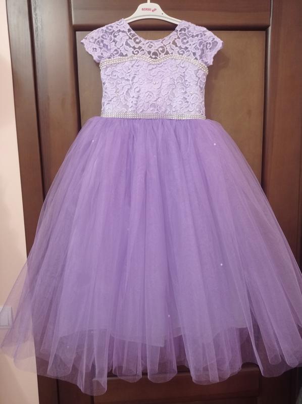 Новое очень красивое платье на выпускной. Качественное кружево, пышный фатин. На спинке есть корсет для утяжки. Размер 122-134. Замеры: длина 95 см, талия 32 см, от плеча до талии 30 см