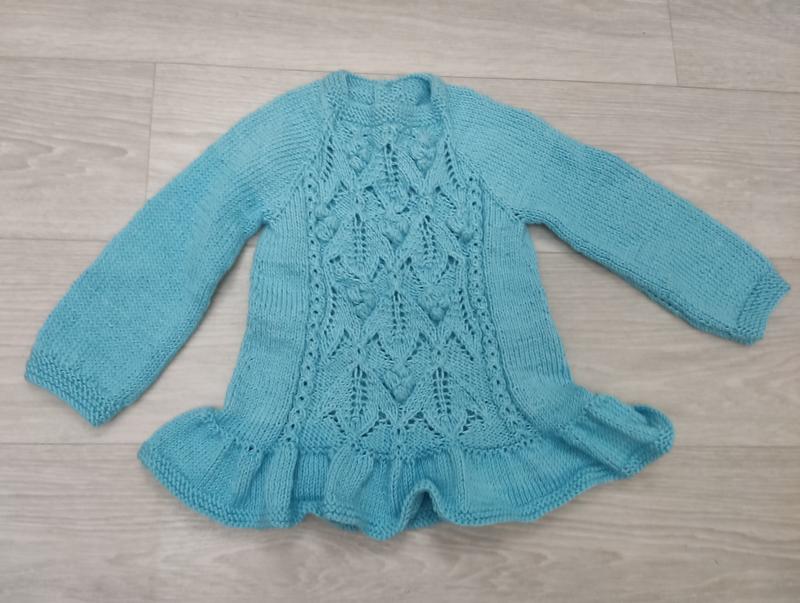 Детское вязаное голубое платье. Ручная работа. На 2-2,5 года. Рост 92-98 см. Состояние новый. Без дефектов. Длина по спинке 42 см. Длина по спинке от подмышки 27 см. Длинна рукава от подмышки 24 см. Обхват груди 56 см. Застежка: пуговицы. Цвет: голубой, как на фото. Материал: пряжа, 100% детский акрил. Пряжа очень мягкая. Невероятно красивый и интересный узор. Нова. Не одягалась. Невероятно красивая, стильная, модная, яркая и очень теплая.
