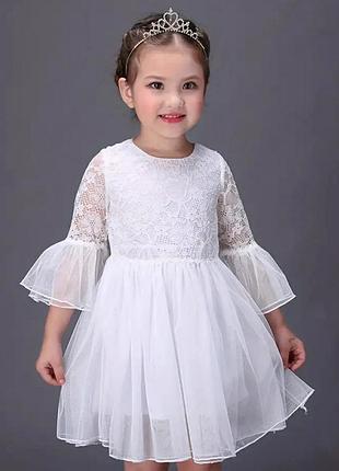 🌹дуже красива ошатна сукня🌹 Верх - мереживо три шари фатину, бавовняна підкладка застібка змійка ⚠колір білий | рукав 3/4 ЗАМІРИ довжина від плеча до пояса/ довжина повна/ ширина по грудях ✅110р 22/55/27 ✅120р 24/60/29 ✅130р 26/65/31 ✅140р 27/70/32 похибка +-1см НАЯВНІСТЬ 110р 5шт 120р 5шт 130р 5шт 140р 5шт