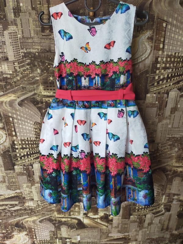 Яркое нарядное платье на девочку размер указан 128, длина 69 см, плечи 24 см, подмышками 33 см, талия 30 см. Цвет молочный с ярким принтом, имеет подъюпник, ткань не мнется, сзади на молнии. Стан идеален.