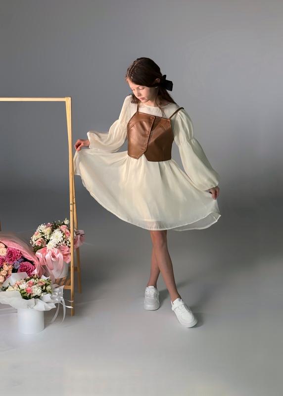 Очень красивое платье. 🧷 Шифон + хб подклад. 🧷 Корсет: эко кожа. 🧷 По спинке молния. 🧷 Супер качество. Рекомендую !🔥 В наличии: р.140 - длиннее.70см, шир. 36см., рукав 45см(5шт.)