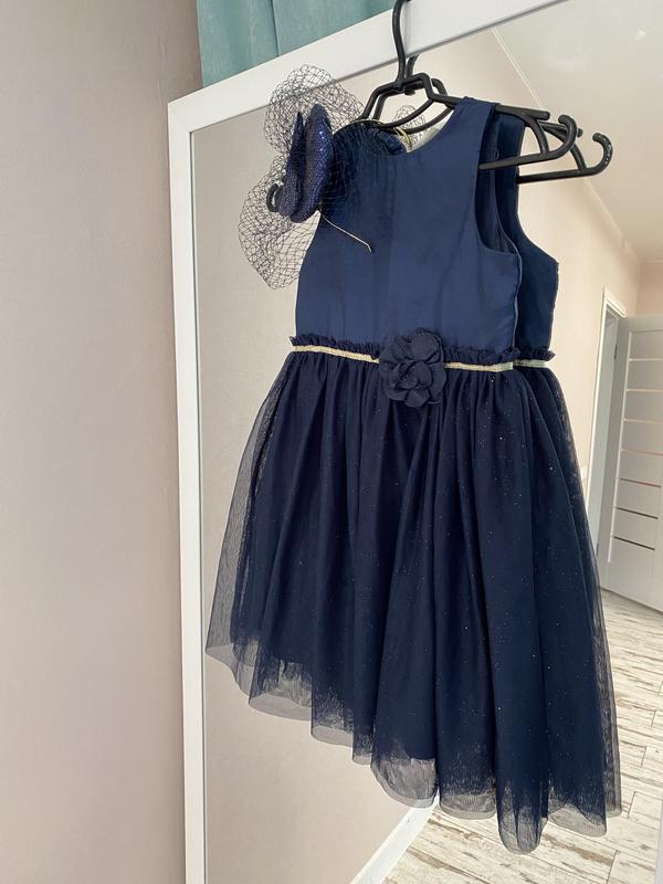 Сукня насиченого темно синього кольору з золотим поясом. Пишна юбка. До неї окремо куплялась вуалетка в такому ж кольорі. На дівчинку 7-8 років 128 см. Недоліків немає)