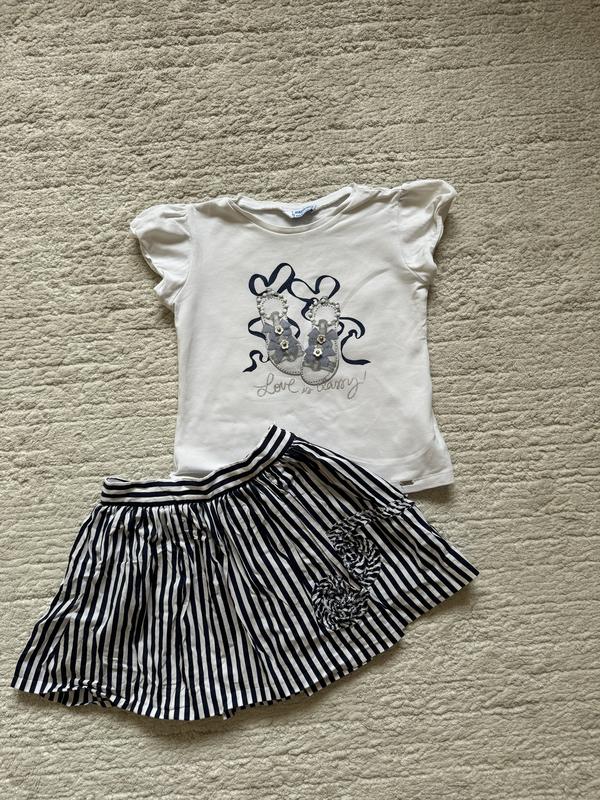 Оригінал,на бірці вказано на 7р,проте підійде на 5/6р,ідеальний стан,без дефектів,спідничка на підкладці,котонова,футболка котон,дуже ніжний і милий набір,ціна 750грн без торгу,купувала набагато дорожче!
