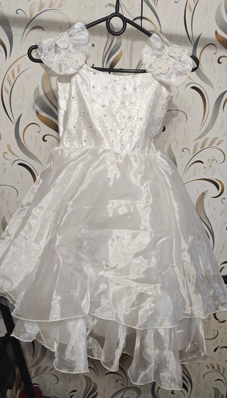 многоярусное платье ,с широким поясом ,украшено камнями и гипбром, на рукавах вышивка стеклярусом (нет шнурочка)