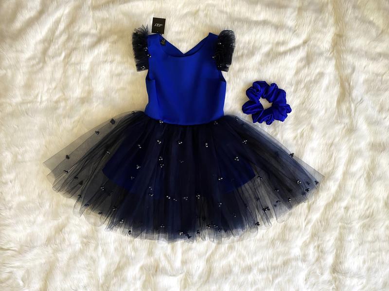 Платье ярко синего цвета с темнл-синим и черным фатином. Украшена бусинками. Ззаду на гудзиках. К платью в подарок идет шелковая резинка, которая не затягивает и не вредит волосам! Пожалуйста внимательно проверяйте товар на поште, потому что возврату не подлежит! На все вопросы ответь! Приятных вам покупок!)