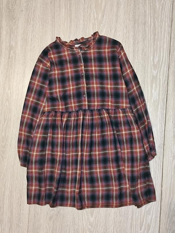 Фирменное, теплое платье на 11 лет выполненное из мягкого хлопка. Спереди застегивается на пуговицы, воротник стойка, есть кошени. Ткань в виде байка, но не плотная. Тканина 100% бавовна. Состояние отлично Замеры: длина по спинке от плеча 74,5 см, длина от талии 42 см, ширина между подмышками 44,5 см, плечи 42 см, рукав от плеча 47 см, по внутреннему шву 40 см