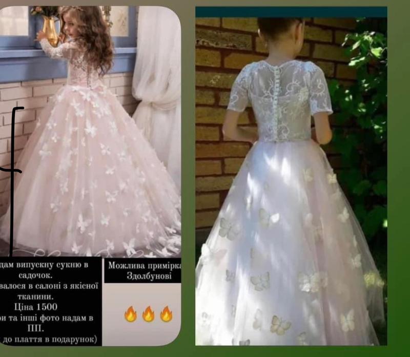 заміри: від плеча до талї 29 вся довжина 102 талія 26,5 *2 плечі 25,5 рукав 19 від талії і донизу 73 під мишкамти 30,5 *2 корсет стягується шнурівкою. В подарунок- підюпник. Колір- пудра. Метелики гарно блищать сріблом! Шили в ательє. Фатин- гарний, ніжний приємний.
