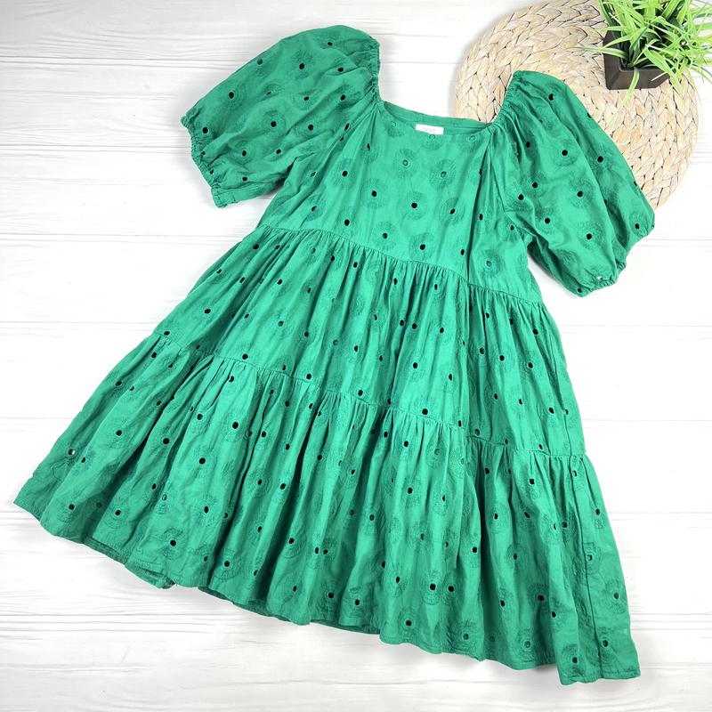 Соковито-зелена, ярусна сукня з вишивкою решільє від next на 8 років, 128 см.