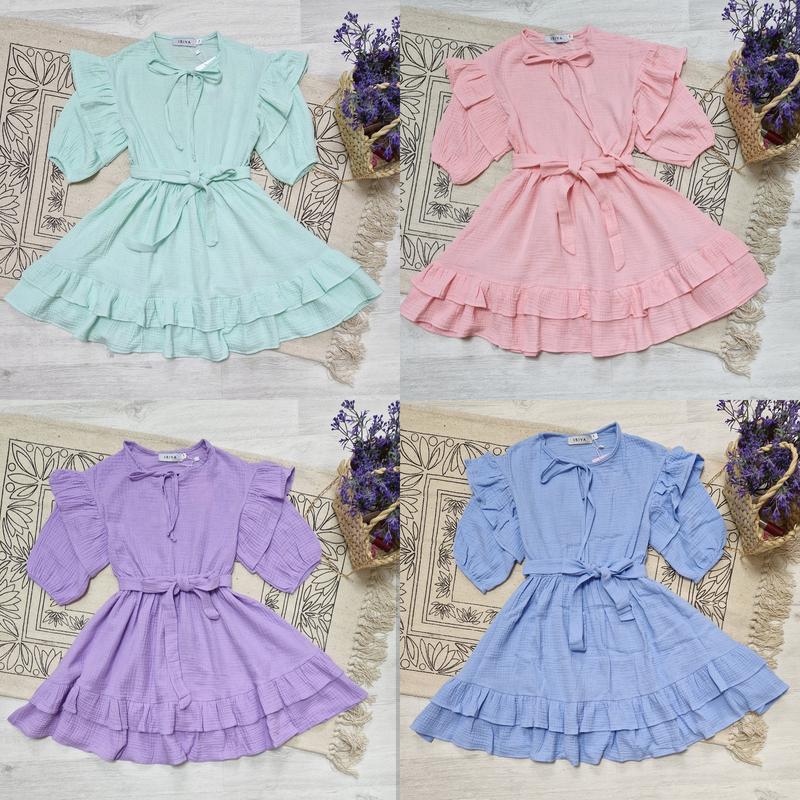 РОЗПРОДАЖ 💐 Нежное платье для модницы невероятной красоты ткань муслин с пышными воланами в талии под резинку и поясок РЕКОМЕНДУЮ! 🔥 длина/пог/рукав от плеча (3/4) 128р-67/36/34 134р-70/37/35