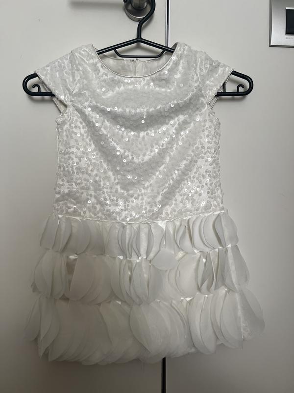 Біле красиве плаття в паєтках. Плаття до колін. Стан хороший. Трохи ззаді поторлчився фатін. При носінні не помітно